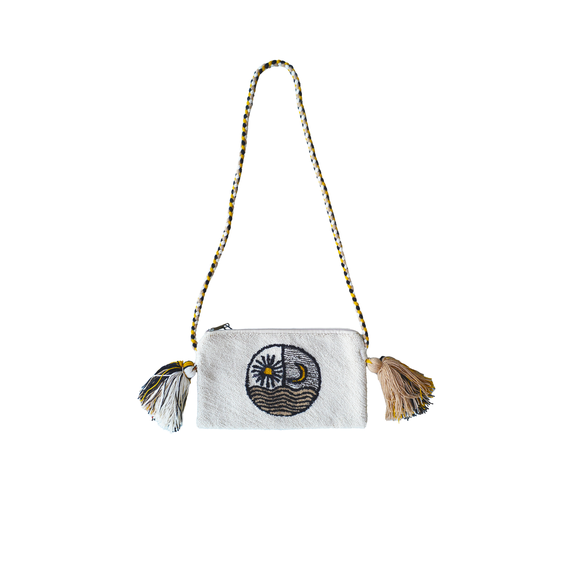 Pochette traditionnelle Wayuu avec bandoulière tressée fine (0,6 cm)  et fermeture éclair, confectionnée artisanalement à la Guajira, en Colombie.