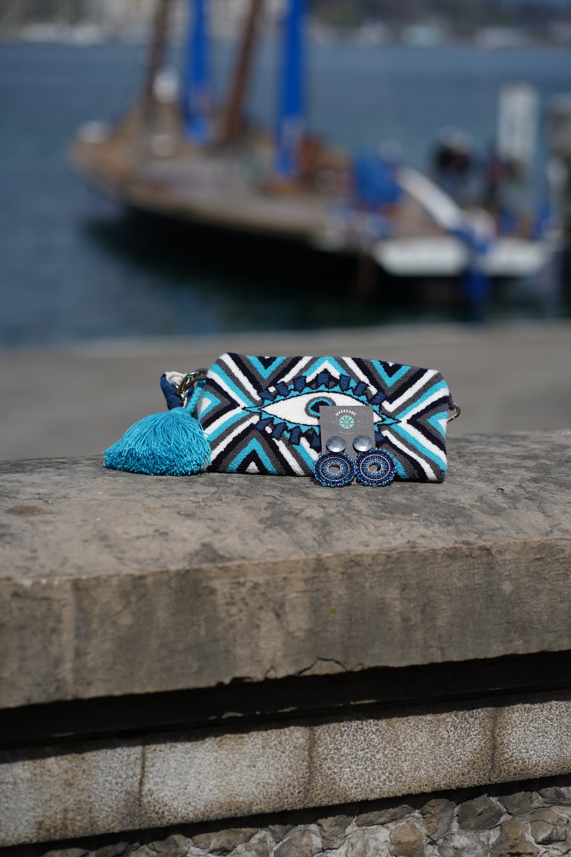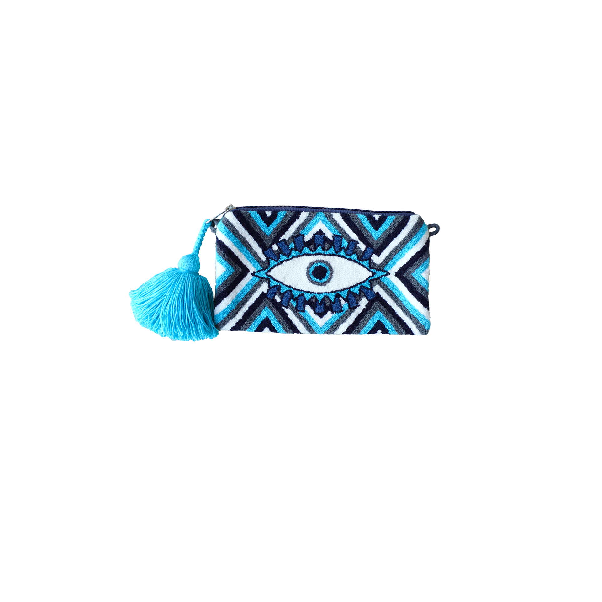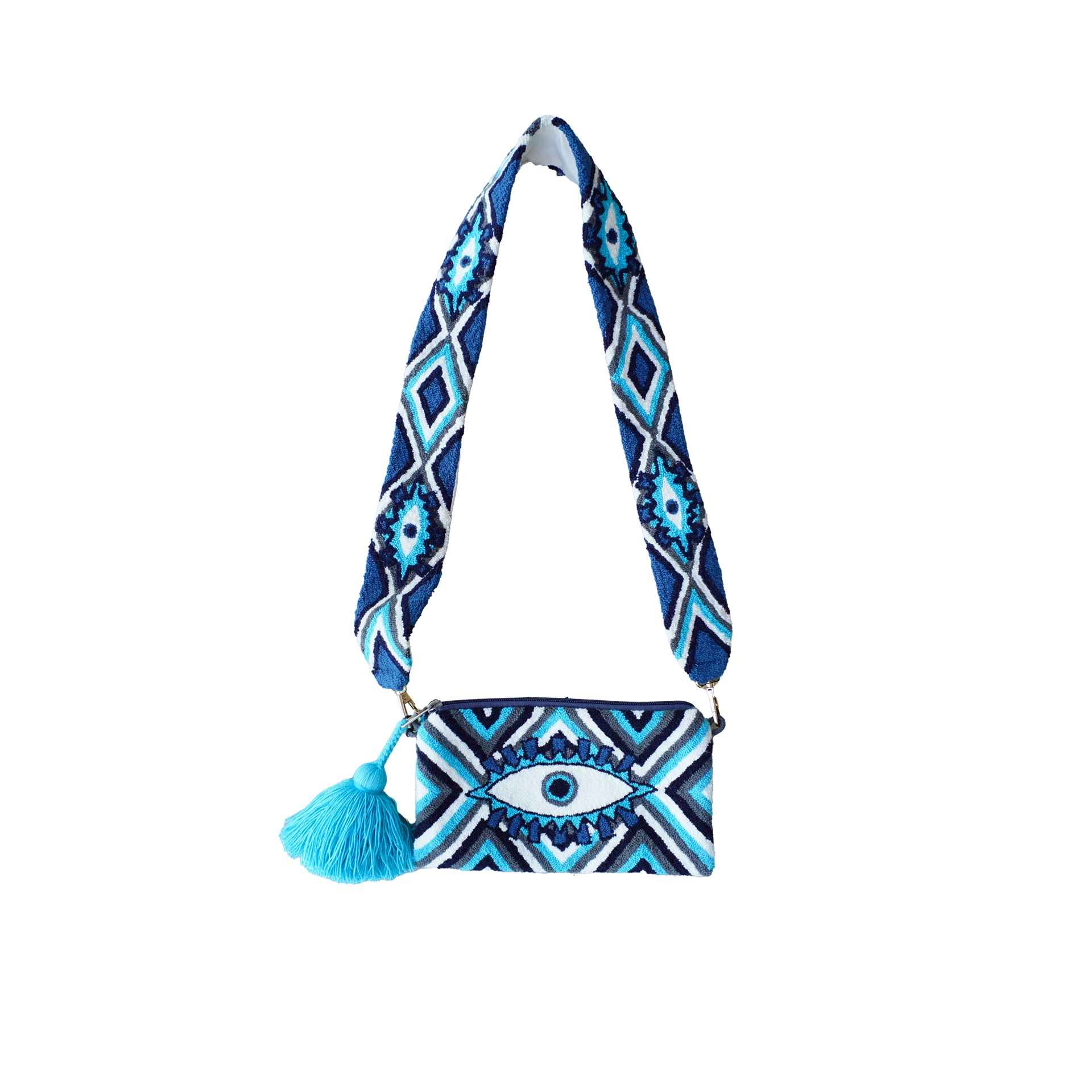 Pochette traditionnelle Wayuu avec bandoulière tressée large (6 cm) détachable et fermeture éclair, confectionnée artisanalement à la Guajira, en Colombie.